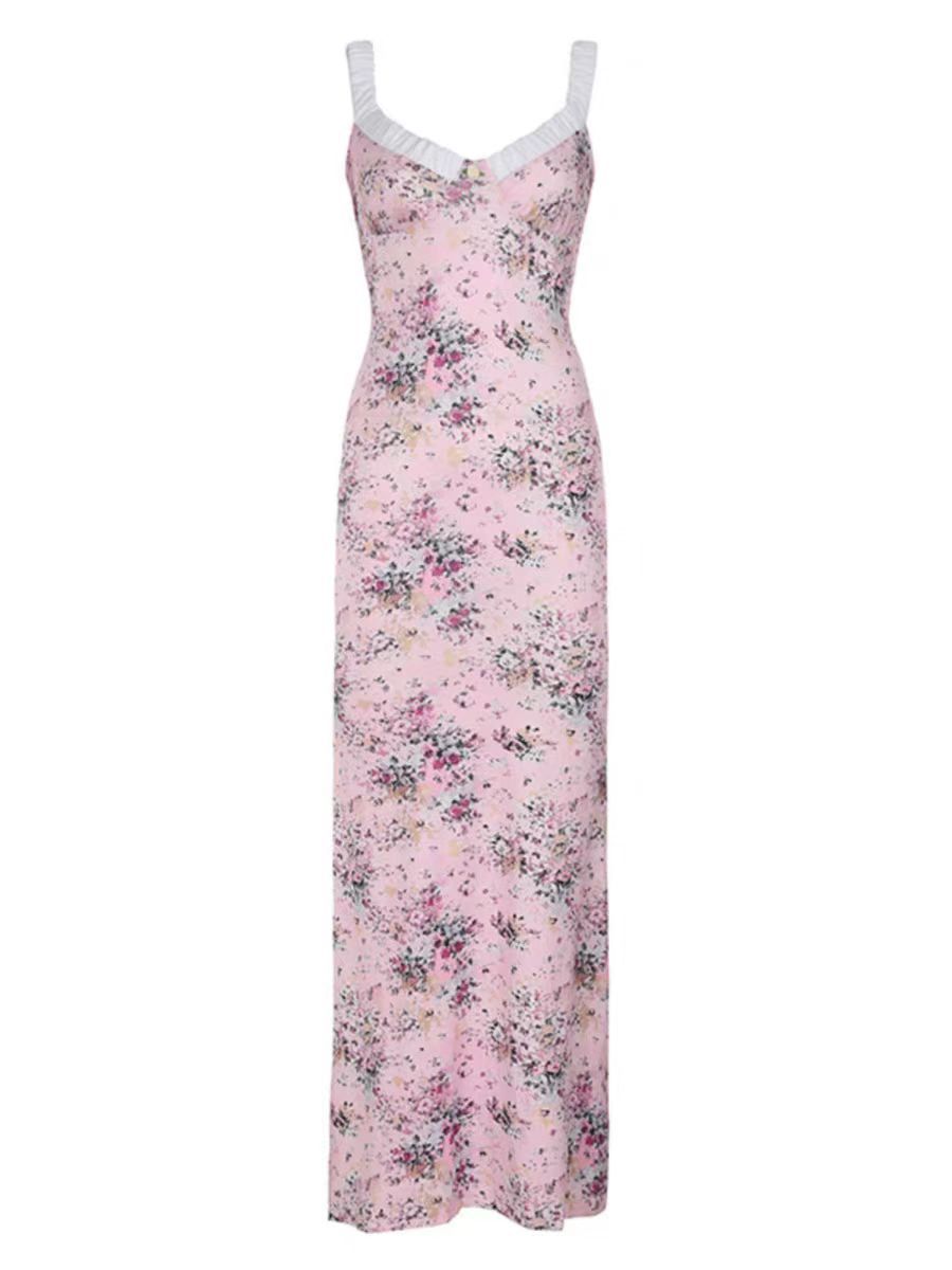 Floral Print Dress With Ruching Flattering Spaghetti Strap Bodycon Maxi Skirt